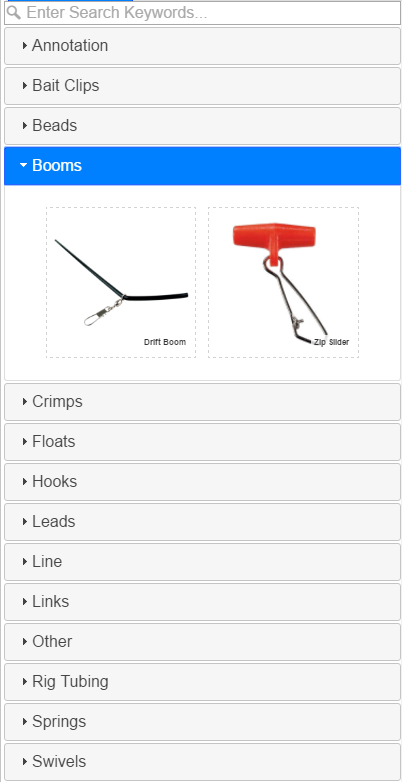 Use the component library panel to find all the parts for your rig. Components are categorised by "type", and you can use the search bar at the top to look for specific parts.